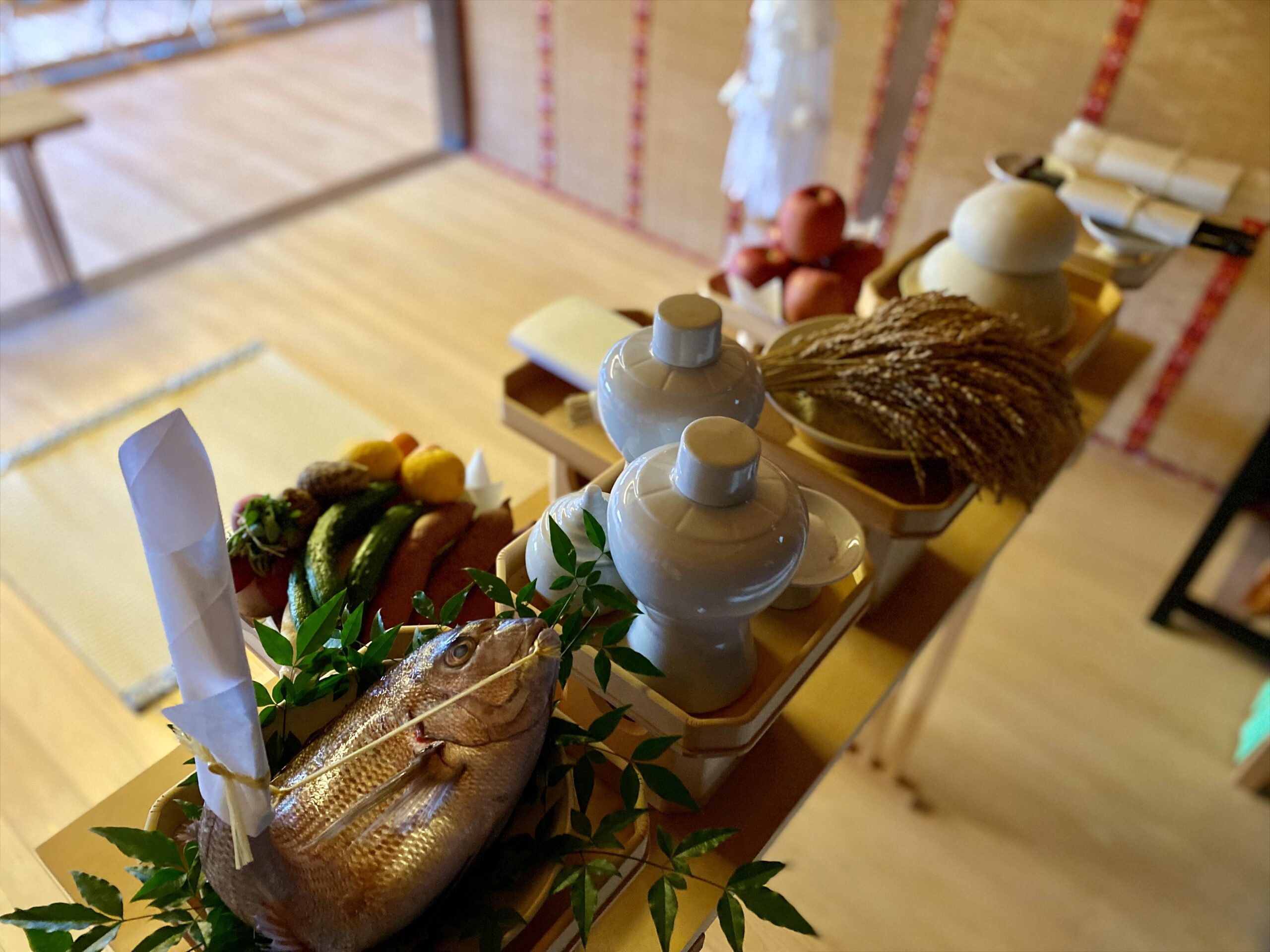 氏子崇敬者の皆様からご奉納いただきましたお米や野菜、果物を神前に奉りました。本年の五穀豊穣と感謝の意を捧げさせていただきました。